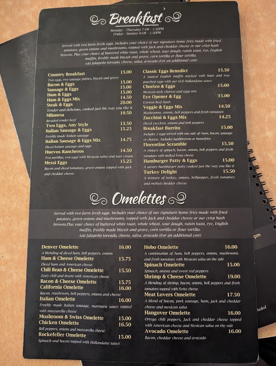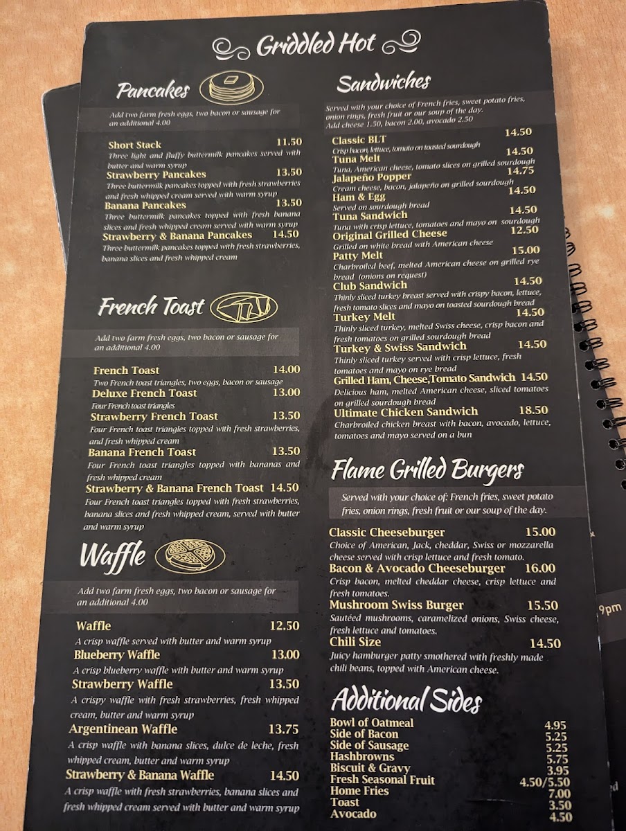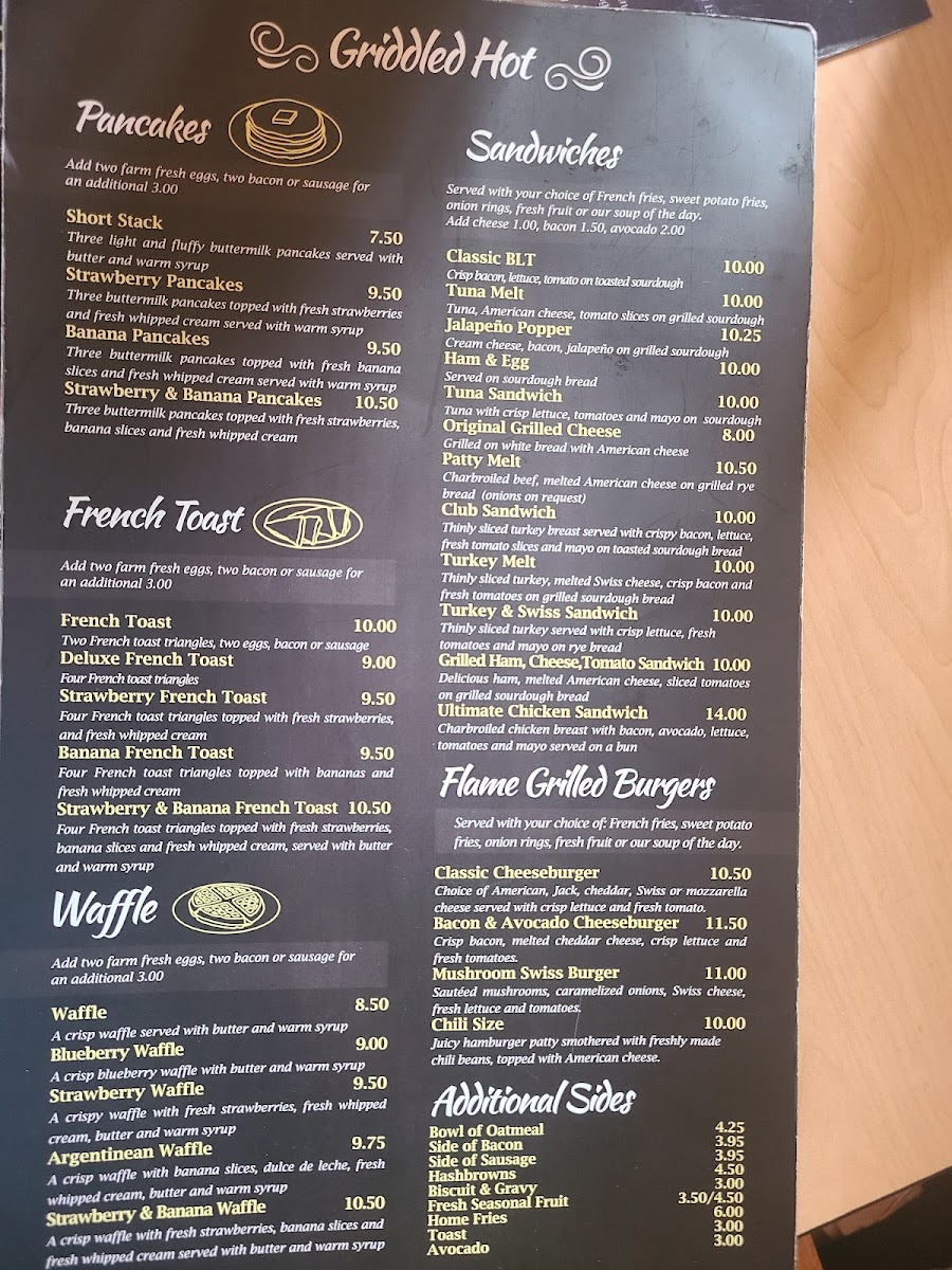 Monday-Thursday (7:00 am-1:30 pm) Friday-Sunday (6:00 am-1:30 pm). Delicious ham, melted American cheese, sliced tomatoes on grilled sourdough bread. Served with your choice of French fries, sweet potato fries, onion rings, fresh fruits or our soup of the day.